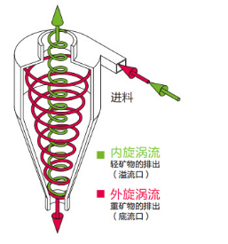 利用強(qiáng)力的離心力來實現(xiàn)混合物在高速旋轉(zhuǎn)下的分離。例如經(jīng)典的靜態(tài)式水力旋流器,利用外部壓力把進(jìn)料混合物以較大的速度推入旋流器內(nèi)部,由于該混合物是順著旋流器的切向運動的,這將促使液體沿筒壁作旋轉(zhuǎn)運動,一般把這種運動稱為外旋流。