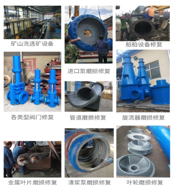 耐磨防腐顆粒膠雙組份,以陶瓷、金屬碳化物、微型顆粒為骨材的耐磨復(fù)合材料,具有耐水、耐油、耐酸堿性。適用(-60℃-80℃)設(shè)備過(guò)流沖蝕、設(shè)備的大面積修復(fù)、設(shè)備預(yù)涂耐磨層,如旋流器、浮選柱、浮選機(jī)、泡沫槽、分級(jí)機(jī)、攪拌桶、溜槽、管件類(lèi)、渣漿泵等設(shè)備修復(fù)(典型用途見(jiàn)主要物理機(jī)械性能表)。碳化物系列設(shè)備專用修復(fù)材料,采用高性能碳化物耐磨防腐技術(shù),對(duì)于各種不同工況,配合工藝方案,解決機(jī)械設(shè)備的磨損問(wèn)題。